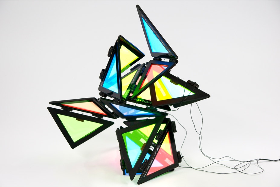 The TLO (Triangle Light Object or Trans- parent Light Origami) is made from 16 triangular lighting panels. Each panel is connected to the next with a friction hinge allowing the structure to be folded and bent into an endless variety of shapes.
