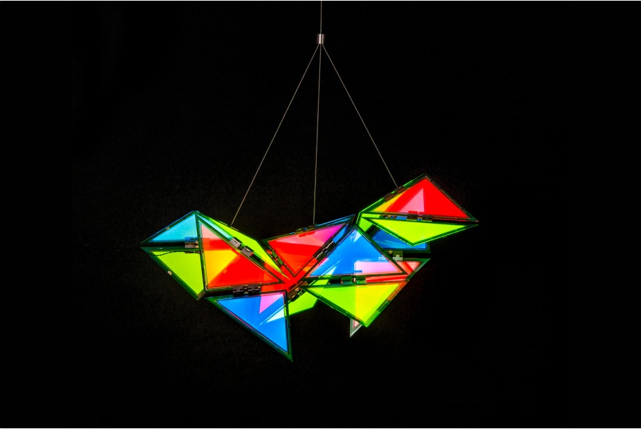 The TLO (Triangle Light Object or Trans- parent Light Origami) is made from 16 triangular lighting panels. Each panel is connected to the next with a friction hinge allowing the structure to be folded and bent into an endless variety of shapes.