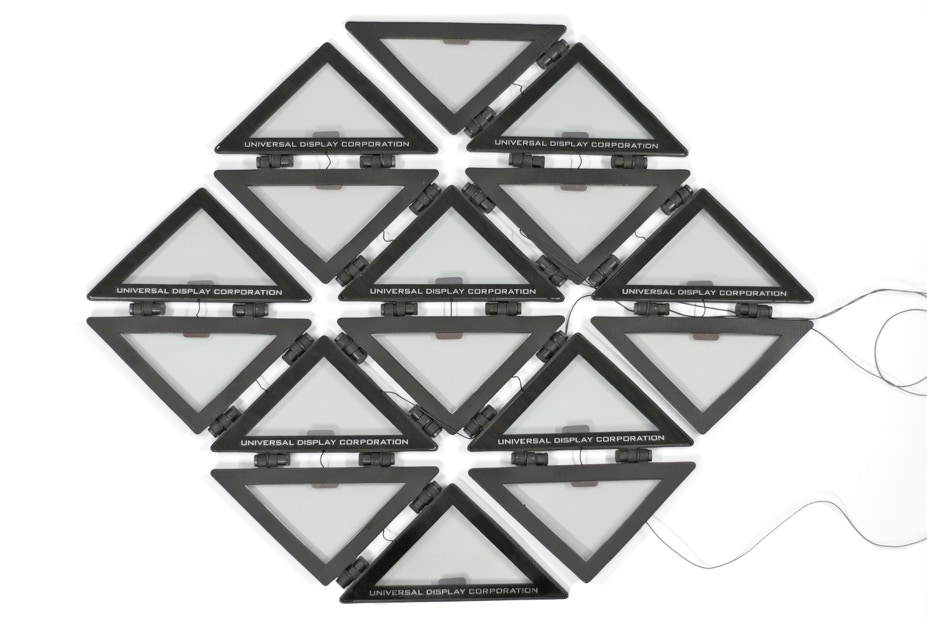 The TLO (Triangle Light Object or Trans- parent Light Origami) is made from 16 triangular lighting panels. Each panel is connected to the next with a friction hinge allowing the structure to be folded and bent into an endless variety of shapes.