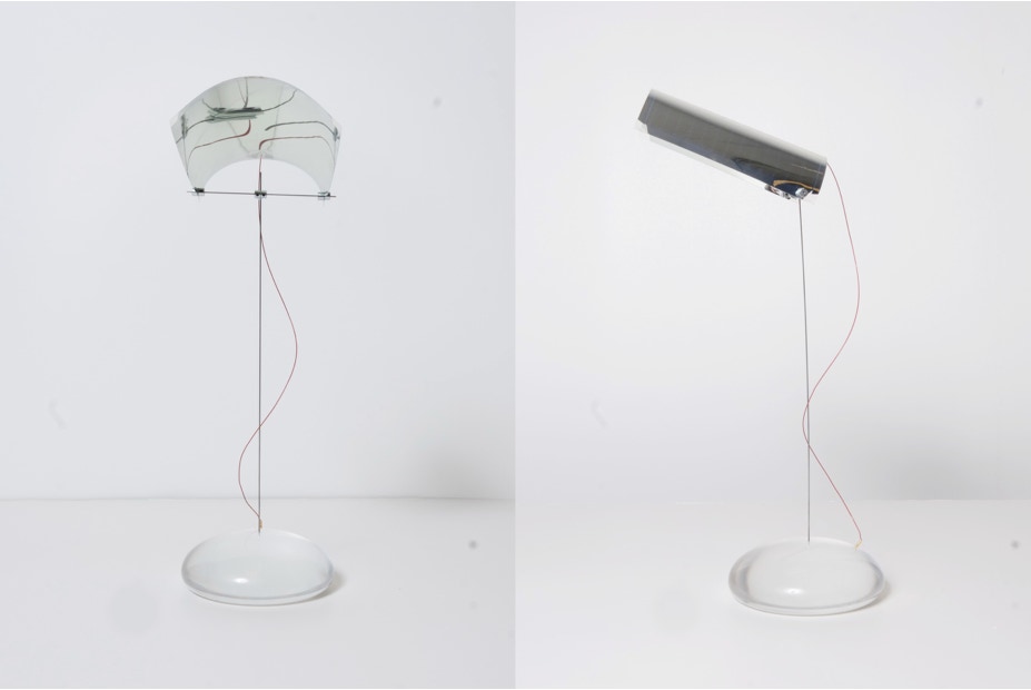 At every step of development was the question, what could be done away with? I found that by introducing a slight curve to the panel it could be made self-supporting, only requiring a thin wire at one end to hold it in tension. I then experimented with various thicknesses of spring steel, finding one that would hold the panel upright without collapsing. This would also become one of the electrodes to power the panel. For the other electrode I chose a thin red wire, an ode to Ingo Maurer's Lucellino lamps.