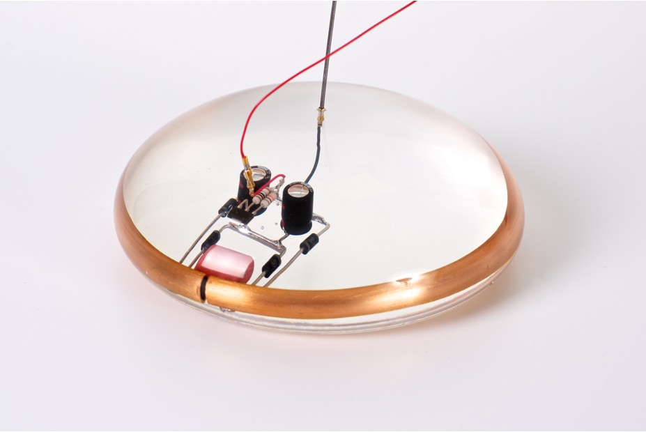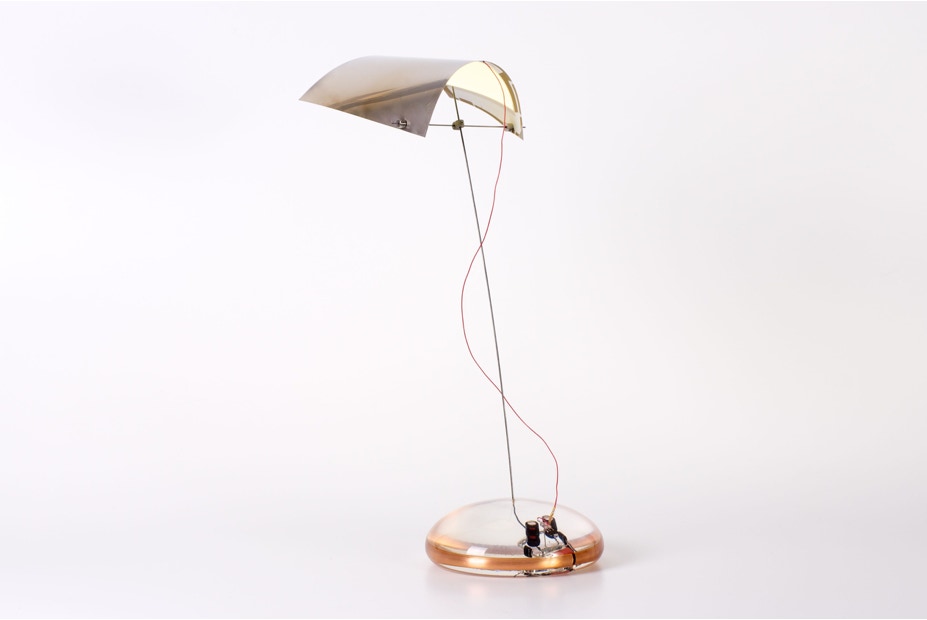 There was a lot of buzz regarding wireless power in the tech industry at this time, so I decided to see if I could create this lamp without a power cord. The energy requirements were low enough that it seemed possible. I worked with a technician on our team to create a simple decoupled transformer that would power the panel as long as the receiving antenna was directly above the transmitter.